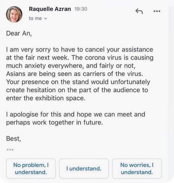 Zelda Solomon discusses the problems of digital discrimination and the racist underpinnings of algorithms, through the incident with An Nguyen, a Vietnamese curator due to exhibit at the Affordable Arts Fair, only to be rejected because of the Covid-19 pandemic and its associations with ‘Asianness’.