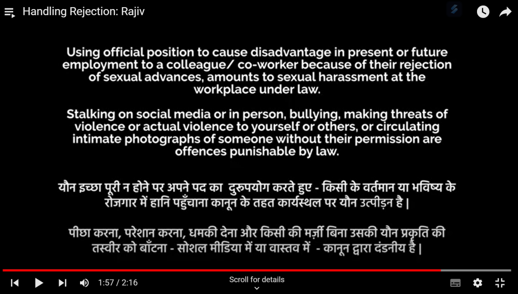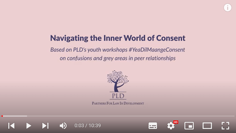This is a series of 11 short videos on consent and rejection – conversation starters to nuance framing consent beyond binaries of victim-perpetrator, or yes-no, developed from real stories that emerged through the sexual harassment prevention work carried out by Partners for Law in Development, the video-series encourages critical, self-aware expressions of intimacy and the related grey areas of boundary setting, peer pressure, stereotyping that shape our conduct and assumptions. This series seeks to go beyond crime and punishment to explore and encourage conversations leading to transformatory approaches to popular attitudes and assumptions about sexuality.